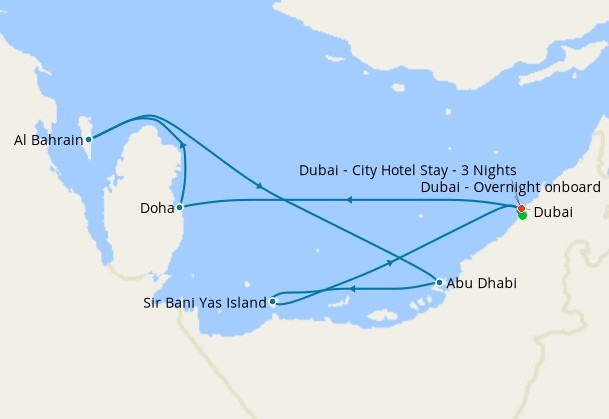 روز اول: پرواز تهران → دبی، ورود به کشتی، آشنایی با امکانات و ترک بندر دبی ساعت ۱۹:۰۰ به سمت دوحه روز دوم: دوحه، قطر؛ بازدید از موزه هنرهای اسلامی، بازار واقف و کورنیش دوحه، حرکت به سمت بحرین روز سوم: منامه، بحرین؛ بازدید از قلعه بحرین، موزه ملی، بازار باب البحرین، حرکت به سمت ابوظبی روز چهارم: حرکت در دریا؛ استفاده از امکانات کشتی و استراحت روز پنجم: ابوظبی، امارات؛ بازدید از مسجد شیخ زاید، فراری ورلد، لوور ابوظبی، حرکت به سمت صیر بنی یاس روز ششم: صیر بنی یاس، امارات؛ بازدید از جزیره و حیات وحش، حرکت به دبی روز هفتم: دبی؛ بازدید از فوارهها، بازارها و مراکز خرید روز هشتم: پایان سفر؛ خروج از کشتی و پرواز دبی → تهران